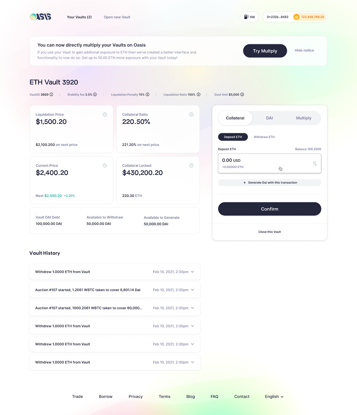 또는 메이커 볼트를 개설하고, 담보를 예치한 후, 담보에 대한 새로운 다이를 발행할 수도 있습니다. 예를 들어, 앞서 언급한 오아시스 앱은 몇 번의 클릭만으로 메이커 볼트를 설정하고 이더와 같은 담보를 사용하여 다이를 빌릴 수 있는 간단한 인터페이스를 제공합니다. 그런 다음 필요에 따라 DAI를 판매하고 일정에 따라 대출금을 상환할 수 있습니다.
