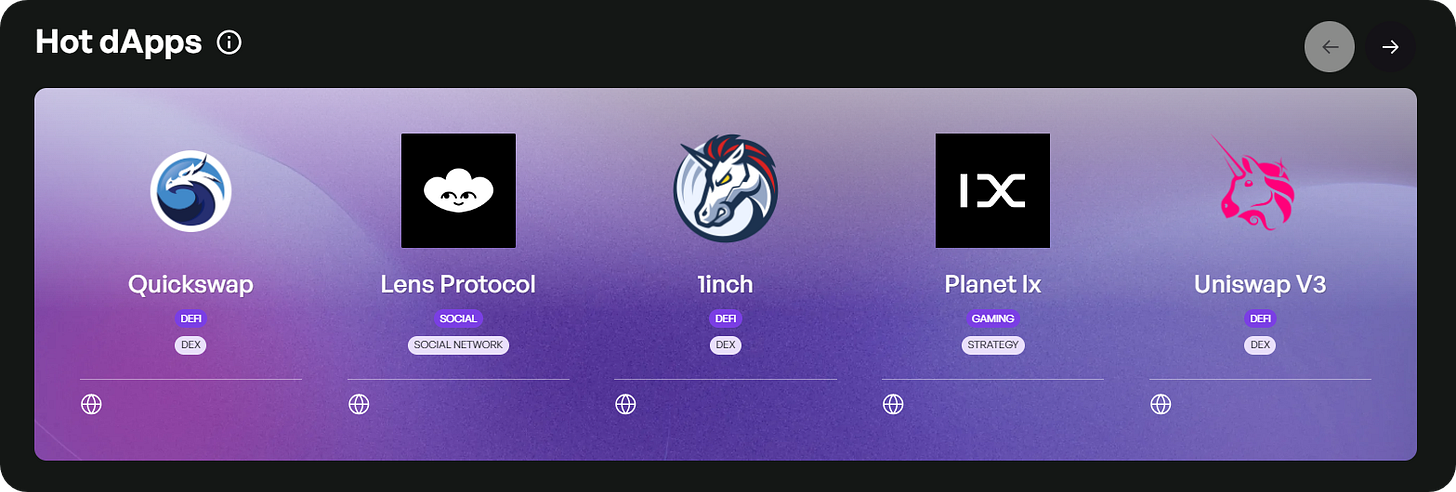 폴리곤 앱 생태계는 크립토 업계에서 가장 큰 규모를 자랑하며, 현재 600개가 넘는 프로젝트를 보유하고 있습니다. 다음과 같은 인기 디앱들이 있습니다.