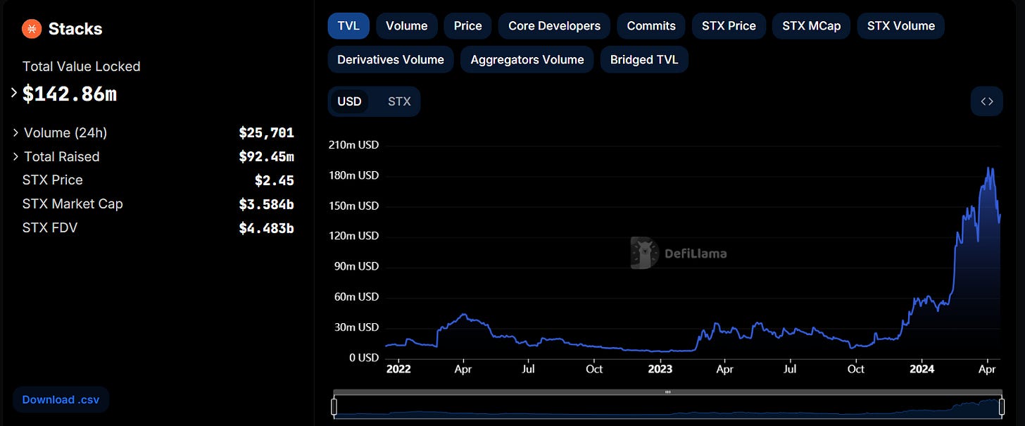 디파이라마에 따르면 스택은 현재 6,100만 달러의 TVL을 기준으로 38번째로 큰 탈중앙 금융 체인입니다. (2024.04.19 기준 25위로 성장) 스택스의 디앱 수는 적지만, DEX, 대출, 유동성 스테이킹 카테고리에 걸쳐 NFT 프로젝트와 디파이 프로토콜을 보유하고 있습니다.