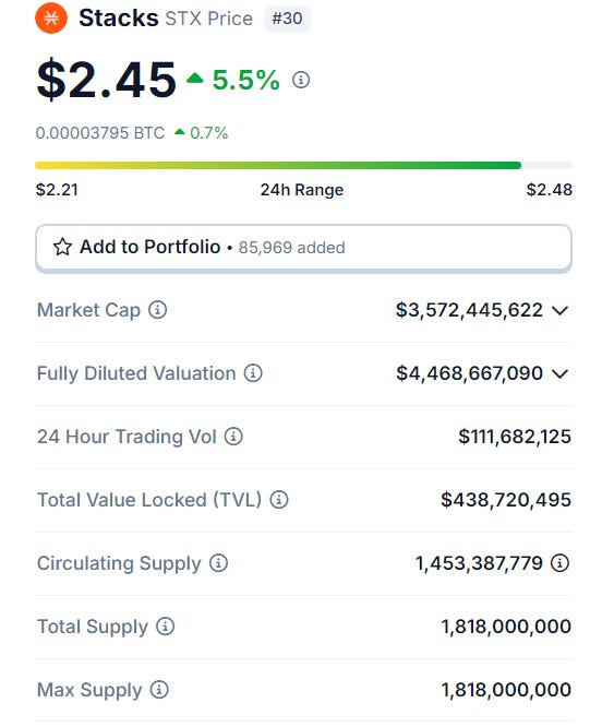 이 가이드의 최신 업데이트 시점에 $STX는 1.76달러에 거래되었으며 시가총액은 25억 달러로, 현재 40번째로 큰 크립토입니다.(2024.04.19 기준, $STX의 가격은 약 $2.47로 전체 시총 27위)